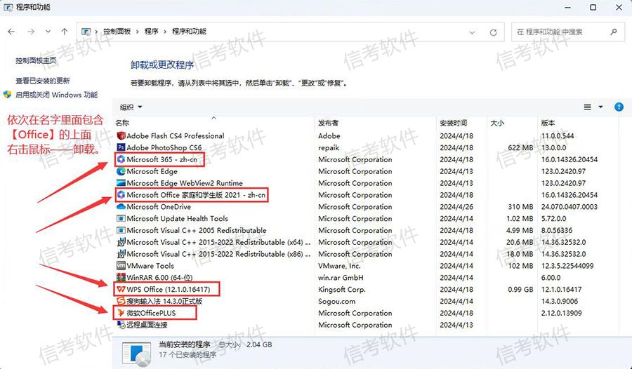 2、依次在名字里面包含【Office】的上面右擊鼠標——卸載。直至列表中找不到名字中包含【Office】的存在為止。
