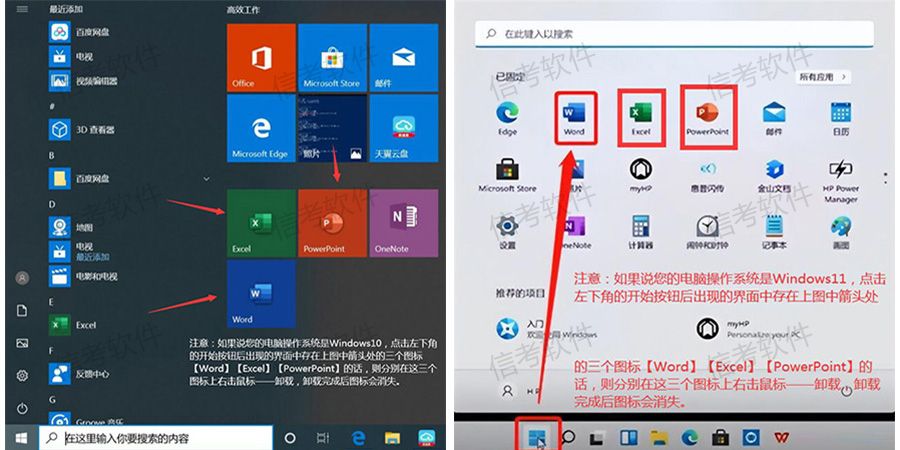 3、注意:如果說您的電腦操作系統(tǒng)是Windows10/11,點擊左下角的開始按鈕后出現(xiàn)的界面中存在上圖中箭頭處的三個圖標【W(wǎng)ord】【Excel】【PowerPoint】的話,則分別在這三個圖標上右擊鼠標——卸載,卸載完成后圖標會消失。